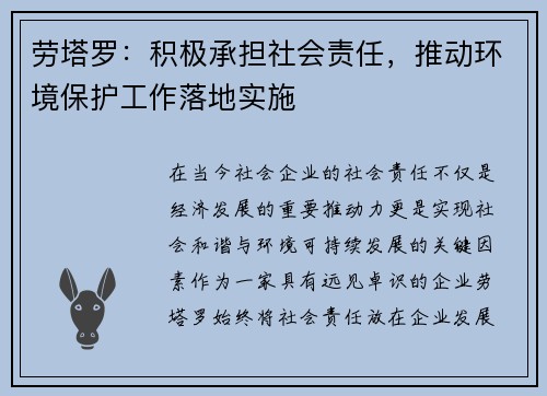 在当今社会,企业的社会责任不仅是经济发展的重要推动力,更是实现社会和谐与环境可持续发展的关键因素。作为一家具有远见卓识的企业,劳塔罗始终将社会责任放在企业发展的重要位置,并以实际行动推动环境保护工作落...
