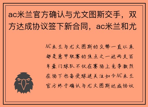 AC米兰与尤文图斯的交锋,一直以来都是意甲联赛的焦点之一。这两支百年豪门球队不仅在赛场上竞争激烈,在场下也备受球迷关注。如今,AC米兰官方终于确认与尤文图斯达成协议,双方签下新合同的消息再次点燃了球迷...