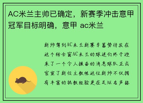 新帅驾到,AC米兰新赛季蓄势待发 在这个转会窗,AC米兰的球迷们终于迎来了一个令人振奋的消息——球队正式官宣了新任主教练。这位新帅不仅拥有丰富的执教经验,更在足坛名声赫赫,他的到来让整个米兰俱乐部的士...