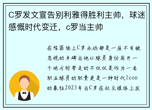 在绿茵场上,C罗永远都是一座不可被忽视的丰碑。当他以球员身份离开一个地方时,带走的不仅仅是作为一名职业球员的职责,更是一种时代Icon的象征。2023年,当C罗在社交媒体上发文告别利雅得胜利主帅时,全...