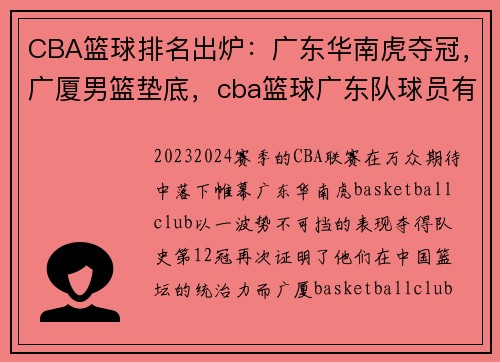 2023-2024赛季的CBA联赛在万众期待中落下帷幕,广东华南虎basketballclub以一波势不可挡的表现夺得队史第12冠,再次证明了他们在中国篮坛的统治力。而广厦basketballclub...