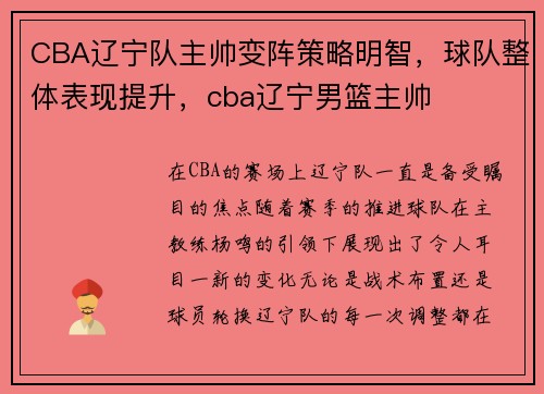 在CBA的赛场上,辽宁队一直是备受瞩目的焦点。随着赛季的推进,球队在主教练杨鸣的引领下,展现出了令人耳目一新的变化。无论是战术布置还是球员轮换,辽宁队的每一次调整都在为球队注入新的活力。本赛季,辽宁队...