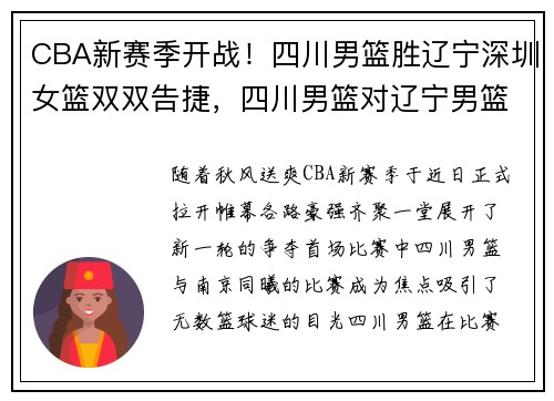 随着秋风送爽,CBA新赛季于近日正式拉开帷幕,各路豪强齐聚一堂,展开了新一轮的争夺。首场比赛中,四川男篮与南京同曦的比赛成为焦点,吸引了无数篮球迷的目光。四川男篮在比赛中展现了强大的实力,凭借团队协作...