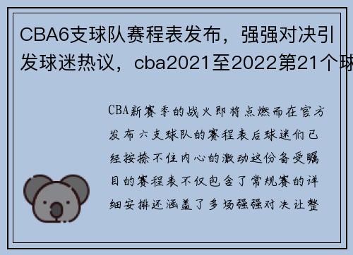 CBA新赛季的战火即将点燃,而在官方发布六支球队的赛程表后,球迷们已经按捺不住内心的激动。这份备受瞩目的赛程表不仅包含了常规赛的详细安排,还涵盖了多场强强对决,让整个赛季充满了悬念与期待。 这份赛程表...