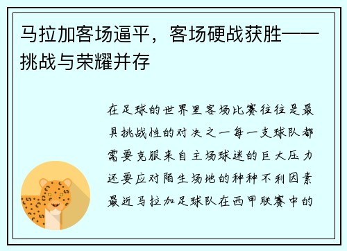 在足球的世界里,客场比赛往往是最具挑战性的对决之一。每一支球队都需要克服来自主场球迷的巨大压力,还要应对陌生场地的种种不利因素。最近,马拉加足球队在西甲联赛中的一场客场比赛,凭借顽强的意志力,展现了他...