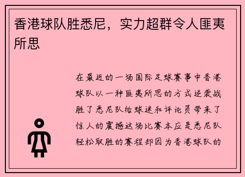 在最近的一场国际足球赛事中,香港球队以一种匪夷所思的方式逆袭战胜了悉尼队,给球迷和评论员带来了惊人的震撼。这场比赛本应是悉尼队轻松取胜的赛程,却因为香港球队的出色表现,让所有人都瞠目结舌。作为亚洲足球...