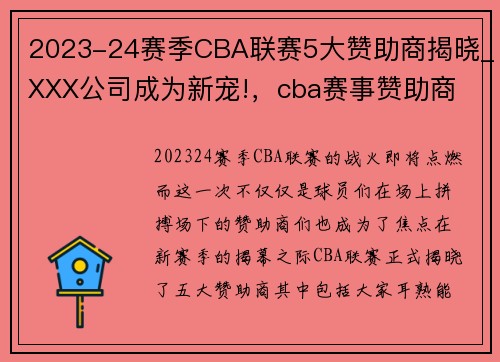 2023-24赛季CBA联赛的战火即将点燃,而这一次,不仅仅是球员们在场上拼搏,场下的赞助商们也成为了焦点。在新赛季的揭幕之际,CBA联赛正式揭晓了五大赞助商,其中包括大家耳熟能详的XXX公司。这些赞...