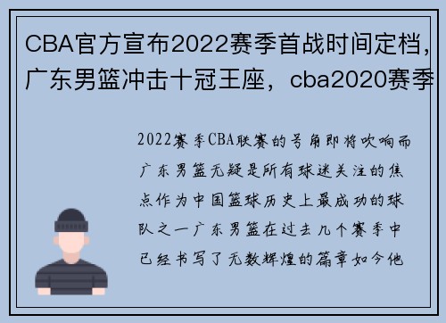 2022赛季CBA联赛的号角即将吹响,而广东男篮无疑是所有球迷关注的焦点。作为中国篮球历史上最成功的球队之一,广东男篮在过去几个赛季中已经书写了无数辉煌的篇章。如今,他们再次踏上冲击第十座总冠军奖杯的...