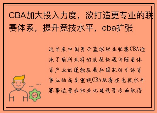 近年来,中国男子篮球职业联赛(CBA)迎来了前所未有的发展机遇。伴随着体育产业的蓬勃发展和国家对于体育事业的高度重视,CBA联赛在竞技水平、赛事运营和职业化建设等方面取得了显著进步。为了进一步巩固和提...