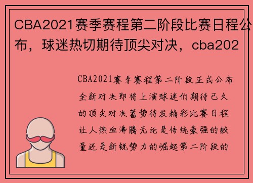 CBA2021赛季赛程第二阶段正式公布!全新对决即将上演,球迷们期待已久的顶尖对决蓄势待发,精彩比赛日程让人热血沸腾。无论是传统豪强的较量,还是新锐势力的崛起,第二阶段的每一场比赛都值得期待。让我们一...