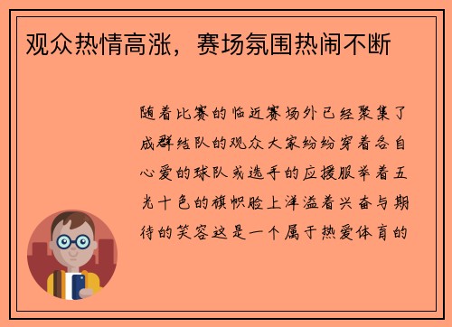 随着比赛的临近,赛场外已经聚集了成群结队的观众,大家纷纷穿着各自心爱的球队或选手的应援服,举着五光十色的旗帜,脸上洋溢着兴奋与期待的笑容。这是一个属于热爱体育的人的狂欢节,赛场内外弥漫着一种激情四溢的...