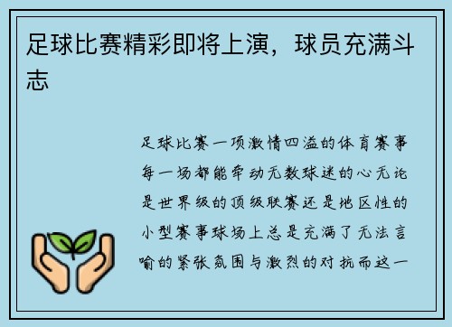 足球比赛,一项激情四溢的体育赛事,每一场都能牵动无数球迷的心。无论是世界级的顶级联赛,还是地区性的小型赛事,球场上总是充满了无法言喻的紧张氛围与激烈的对抗。而这一切,正是足球比赛的魅力所在。当我们站在...