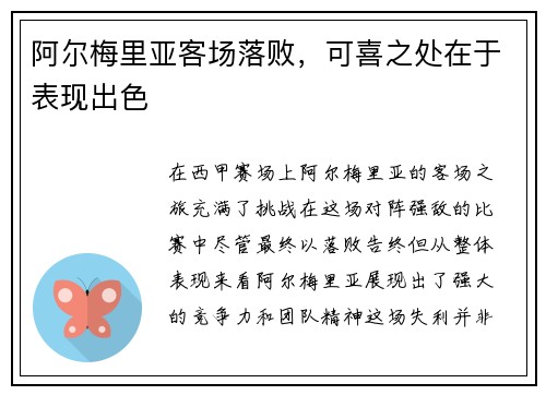 在西甲赛场上,阿尔梅里亚的客场之旅充满了挑战。在这场对阵强敌的比赛中,尽管最终以落败告终,但从整体表现来看,阿尔梅里亚展现出了强大的竞争力和团队精神。这场失利并非让球迷们感到失望,反而激发了大家对球队...