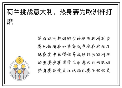 随着欧洲杯的脚步逐渐临近,所有参赛队伍都在加紧备战,争取在这场足球盛宴中获得优异成绩。作为欧洲杯的重要参赛国,荷兰和意大利两队的热身赛,备受关注。这场比赛不仅仅是两支历史悠久的足球强队之间的较量,更是...