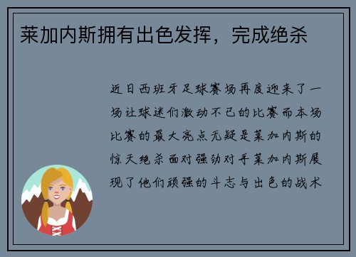 近日,西班牙足球赛场再度迎来了一场让球迷们激动不已的比赛,而本场比赛的最大亮点无疑是莱加内斯的惊天绝杀。面对强劲对手,莱加内斯展现了他们顽强的斗志与出色的战术布置,最终通过一记精彩的绝杀,拿下了比赛的...