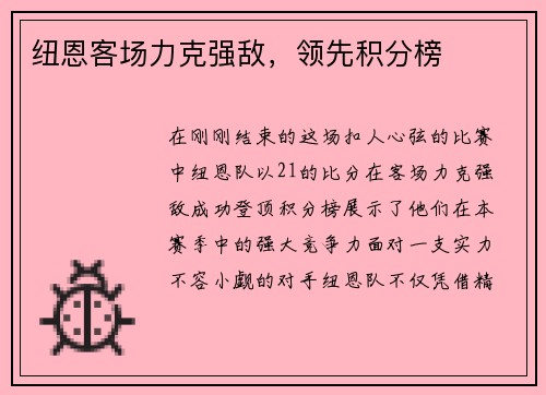 在刚刚结束的这场扣人心弦的比赛中,纽恩队以2-1的比分在客场力克强敌,成功登顶积分榜,展示了他们在本赛季中的强大竞争力。面对一支实力不容小觑的对手,纽恩队不仅凭借精准的战术布置和球员的个人能力,在激烈...