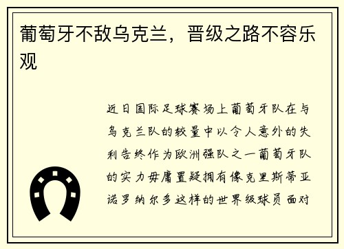 近日,国际足球赛场上,葡萄牙队在与乌克兰队的较量中以令人意外的失利告终。作为欧洲强队之一,葡萄牙队的实力毋庸置疑,拥有像克里斯蒂亚诺·罗纳尔多这样的世界级球员。面对乌克兰队,葡萄牙队未能展现出应有的统...