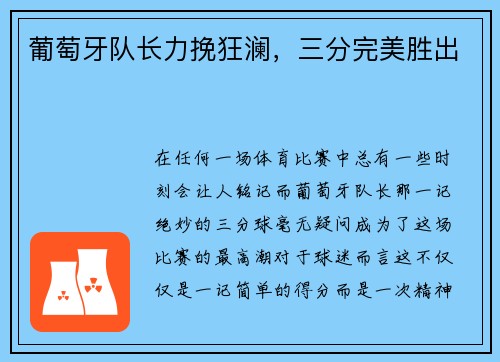 在任何一场体育比赛中,总有一些时刻会让人铭记,而葡萄牙队长那一记绝妙的三分球,毫无疑问成为了这场比赛的最高潮。对于球迷而言,这不仅仅是一记简单的得分,而是一次精神的凝聚,一种团队的象征,也是对不屈不挠...