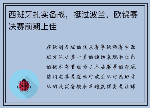 在欧洲足坛的焦点赛事——欧锦赛中,西班牙队以其一贯的强劲表现和出色的战术布置成为了本届赛事的夺冠热门。尤其是在面对波兰队时,西班牙队的扎实备战和卓越发挥更是让球迷们眼前一亮。从小组赛到淘汰赛的每一场战...