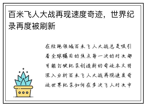在短跑领域,百米飞人大战总是吸引着全球瞩目的焦点。每一次的对决,都可能打破纪录,创造新的奇迹。本文将深入分析百米飞人大战再现速度奇迹,世界纪录如何在多次飞人对决中被刷新。文章从四个方面详细探讨这一主题...