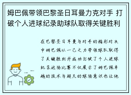 在巴黎圣日耳曼与对手的精彩对决中,姆巴佩以一己之力带领球队取得了关键胜利,并成功打破了个人进球纪录。这场比赛不仅展示了姆巴佩卓越的技术与超凡的球场意识,也让他在足球历史的舞台上留下了浓墨重彩的一笔。随...