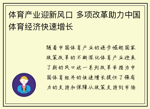 随着中国体育产业的逐步崛起,国家政策改革的不断深化,体育产业迎来了新的风口。这一系列改革举措为中国体育经济的快速增长提供了强有力的支持和保障。从政策支持到市场机制的优化,再到体育文化的全面推广,中国的...