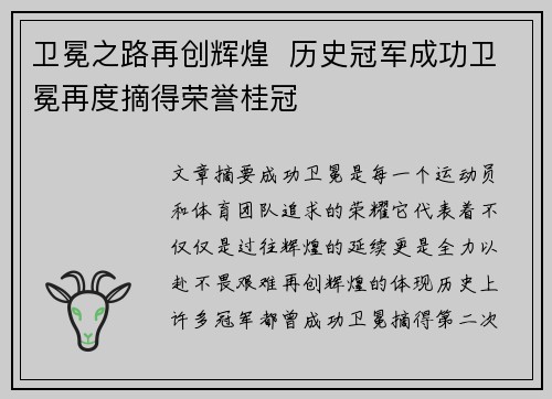 文章摘要:成功卫冕是每一个运动员和体育团队追求的荣耀,它代表着不仅仅是过往辉煌的延续,更是全力以赴、不畏艰难再创辉煌的体现。历史上许多冠军都曾成功卫冕,摘得第二次乃至更多次荣誉桂冠,留下了无数令人振奋...
