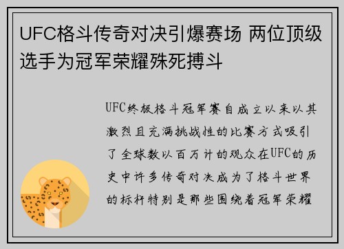 UFC(终极格斗冠军赛)自成立以来,以其激烈且充满挑战性的比赛方式吸引了全球数以百万计的观众。在UFC的历史中,许多传奇对决成为了格斗世界的标杆,特别是那些围绕着冠军荣耀展开的殊死搏斗。本篇文章将通过...