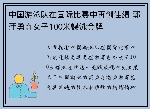 文章摘要:中国游泳队在国际比赛中再创佳绩,尤其是在郭萍勇夺女子100米蝶泳金牌这一亮眼表现中,充分展示了中国游泳的实力与潜力。郭萍凭借其卓越的技术和顽强的拼搏精神,在赛场上脱颖而出,为中国游泳赢得了重...